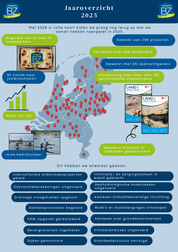Van geohydrologisch onderzoek en dijksterkteberekeningen tot klimaatanalyses, waterbergingsontwerpen en adviezen over grondwateroverlast – het jaaroverzicht laat zien hoe veelzijdig ons werk in 2025 was.
